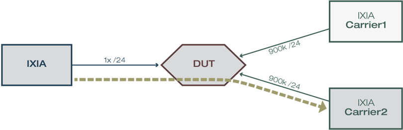 Um die CP/DP-Convergence-Tests durchzuführen, benutzen wir IXIA-Testsysteme von Keysight. Das „Device under Test“ (DUT), welches dem Test unterzogen wird, wird zur rechten mit zwei von der IXIA simulierten BGP-sprechenden Carriern verbunden. Jeder dieser Carrier sendet dieselbe BGP-Full-Table (bestehend aus 900.000 IPv4-Routen) in Richtung des DUT. Es wurde mittels Konfiguration –genutzt wird eine BGP-Policy mit local-pref – dazu gebracht, die Routen von Carrier1 zu bevorzugen. Zusätzlich wird auf der linken Seite noch ein per IXIA simulierter Kunde angeschlossen, der ein einziges /24 IPv4-Prefix sendet.
