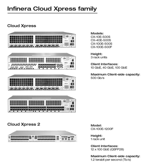 The Cloud Xpress family consists of the Cloud Xpress in 4 different models and the latest-generation the Cloud Xpress 2. While the Cloud Xpress can support a maximum client-side capacity of 500 gigabits per second (Gb/s), Infinera massively improved this with their new Cloud Xpress 2 allowing up to 1.2 terabits per second (Tb/s). At the same time, Infinera could reduce the CX chassis height with the Cloud Xpress 2 from 3 rack units to 1 rack unit. This improvement results in enormous space-saving opportunities for data centre interconnection infrastructures.